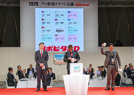 プロ野球のドラフト会議が23日、東京都内のホテルで行われ、立石正広内野手(創価大)は阪神、広島、日本ハムが1位で重複し、阪神が当たりくじを引いた。写真は交渉権を獲得した阪神の藤川球児監督(右)。 【時事通信社】