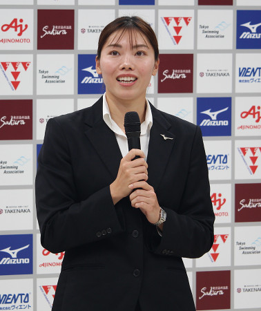 引退セレモニーでスピーチする競泳女子の青木玲緒樹さん。「目標を持って頑張ってきた。応援してくださる方々がいて、本当に幸せで特別な時間だった」と振り返った=2日、東京・アクアティクスセンター 【時事通信社】