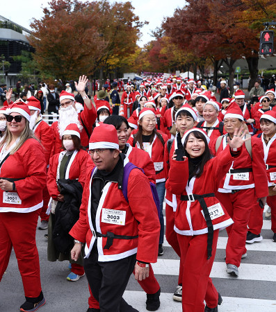 サンタクロースの衣装で渋谷や原宿の目抜き通りを行進するチャリティーイベント「サンタパレード東京2025」が開催された。参加費の一部は病気と闘う子どもたちへのクリスマスプレゼントなどに使われる=16日 【時事通信社】