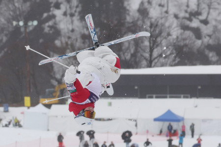 フリースタイルスキーのワールドカップ(W杯)富山なんと大会。女子決勝1回目、冨高日向子のエア。自己最高の2位に入った=28日、富山・たいらスキー場 【時事通信社】